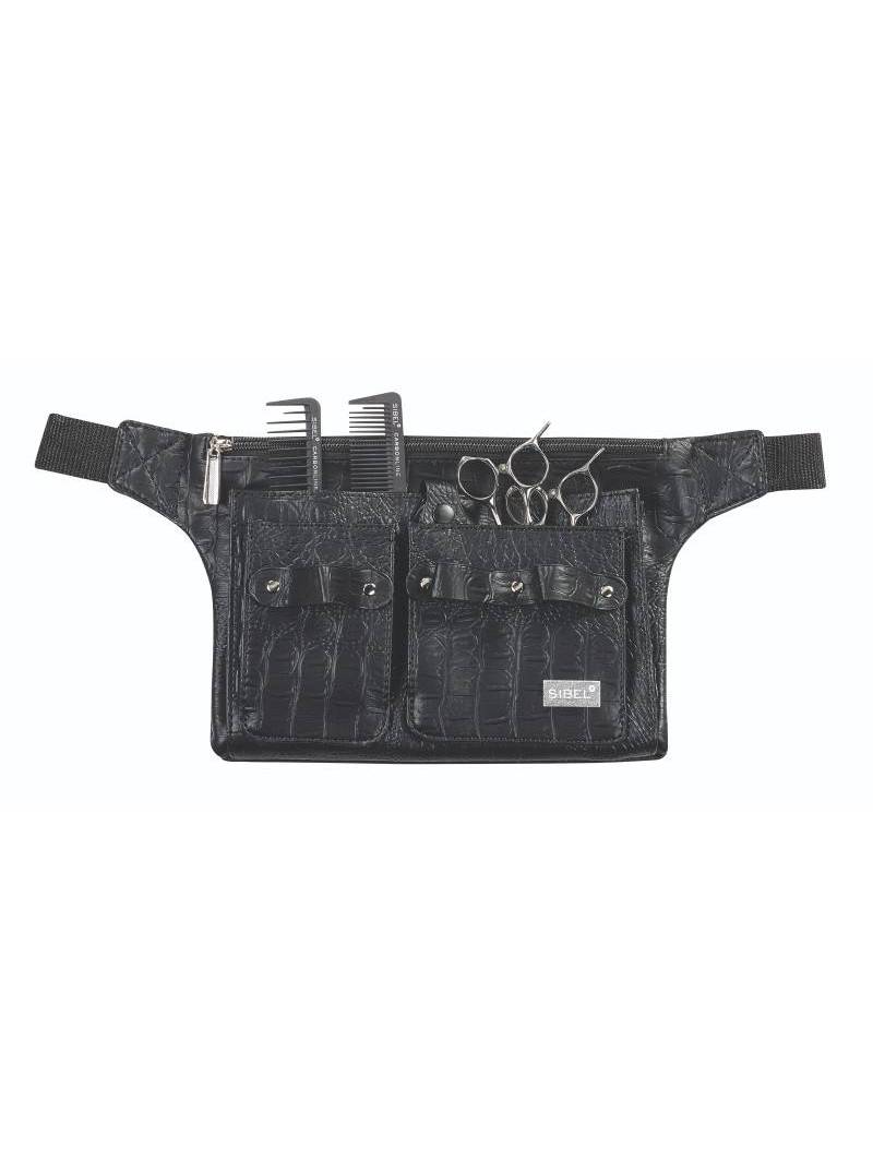 Cinturón de tijeras para sostener hasta 3 tijeras. También tiene compartimentos para guardar peines u otros equipos y un compartimento horizontal con cremallera. La correa se puede ajustar y tiene un cierre tipo clic.