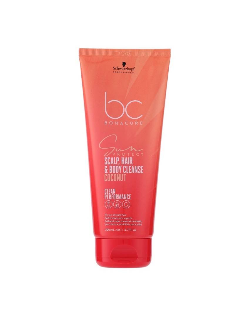 Champú 3-in-1 para Cuero Cabelludo, Cabello y Cuerpo de Bonacure Sun Protect elimina los restos de productos solares, el cloro y el agua salada proporcionando una limpieza refrescante que purifica el cuero cabelludo y cuerpo, y nutre el cabello. Fórmula libre de sulfatos