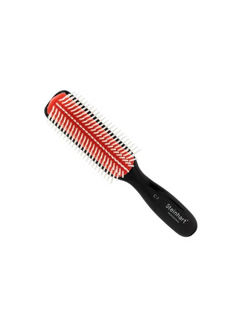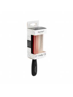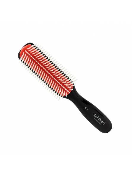 Cepillos Steinhart con mango madera negro con acabado brillante, goma de caucho rojo, y 7 hileras de púas de nylon blancas redondeadas en la punta para un uso confortable. Perfecto para peinar, moldear y dar volumen tanto en pelo rizado como liso. En un pelo rizado separará los rizos y le dará mejor definición. Apto para uso con secador.
