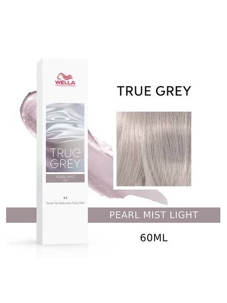 El matizante True Grey Pearl Mist Light de Wella es un tratamiento revitalizante en el salón, para crear un efecto plateado en canas naturales. Revitaliza el cabello canoso a la vez que respeta la estructura original de sus cutículas y ayuda a controlar la dimensión y los juegos claroscuros del cabello. Apto para todo tipo y diferentes porcentajes de canas, del 50% al 100%. La base oxidante suave y sutil de los pigmentos True Grey imitan la vitalidad y los hermosos matices naturales de las canas, mientras se desvanecen de forma natural. Neutraliza los tonos amarillentos y mejora la textura del cabello con True Grey. La cana es bella. ¡Libérala!